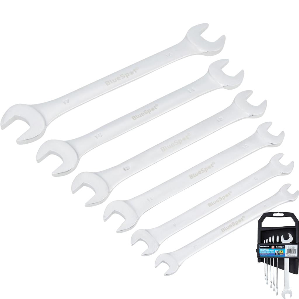 The Blue Spot Tools 6 piece double open end spanner set is manufactured from chrome vanadium for increased durability. Each spanner in this set has a nickel chrome mirror-polished finish for added corrosion resistance.