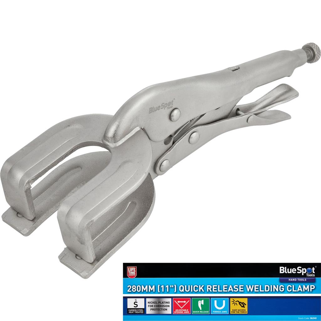 The Blue Spot 280mm (11") quick release welding clamp is manufactured from heat treated carbon steel for increased durability, with a nickel plating to prevent against corrosion. They have adjustable opening jaws and a quick release lever. Unique forked jaws give you better visibility and also allows easier access for the torch.